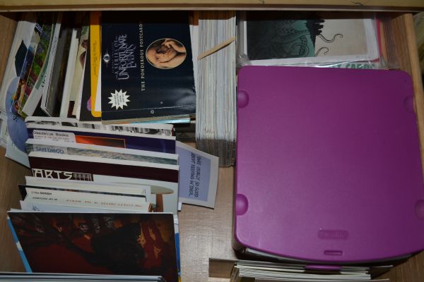 This is my drawer of postcards. It may not look like a lot, but there’s over a thousand in there. That purple container has three drawers that are full, and I have another identical container in another spot.
