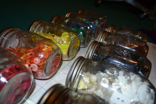 I wrote more about buttons here, where you can see more detailed pictures of them inside the jars. I keep the jars on the top shelf of one of my book cases.