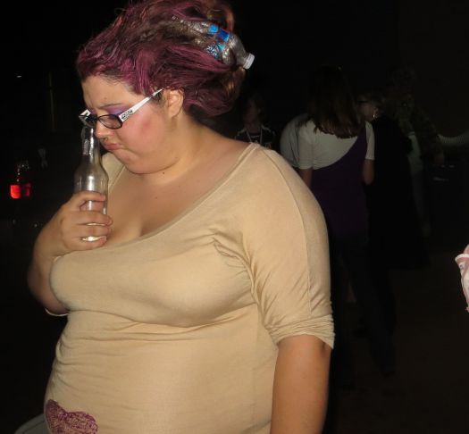 The next costume I wore was a Troll doll. I decided on purple. All I had to do was wear purple shorts, a nude shirt (that I glitter glued a purple heart shaped belly button onto), and I put a water bottle in my hair to get it to stand up.