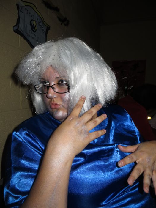 The costume that I wore to the member Halloween party was a space girl, complete with silver skin. I wore a metallic blue shirt and black skirt that I found at the thrift store. The expensive part was the leggings, which surprisingly, I did not already own.