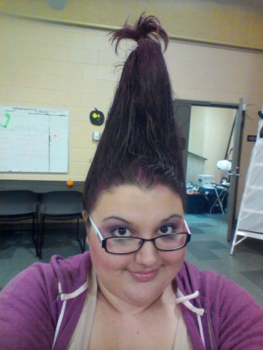 I guess everyone didn’t have cheerleaders at their high school that were really into spirit week, because most people had never seen that trick before! I purple hair sprayed my cone shaped hair afterwards and put on too much blush… and I was good to go!