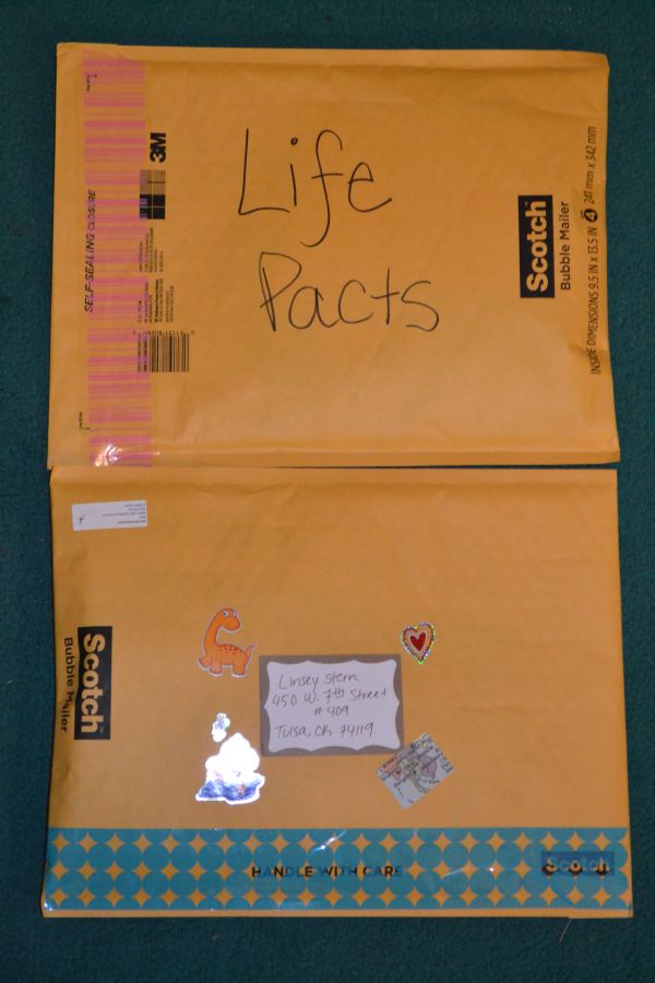 “Your Life Pact package is such a treasure, so very wonderful! It made me feel so happy and blessed and honored and inspired and there are so many more wonderful adjectives I could add here! How could I ever say thank you enough for such a gift? You inspire me SO much–you send gifts and you set up public art for people to interact with and you don’t even expect anything in return, just that people share their enjoyment and happiness with you. Thank you SO much! I’m going to listen to your CD on the way home from work today and I’m going to immediately put to use all the wonderful goodies you’ve sent. Mine probably won’t be as fantastic as yours, but I’m going to send a Life Pact to you now! Thank you for sharing so much with me!”