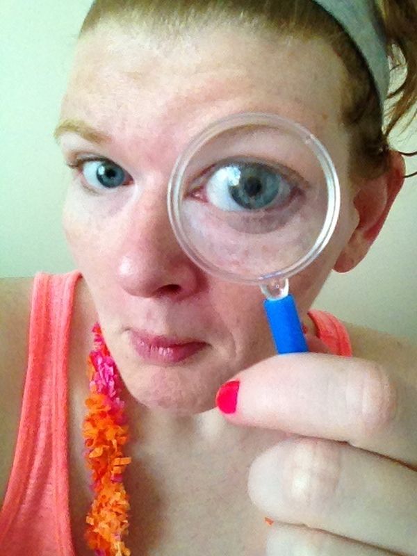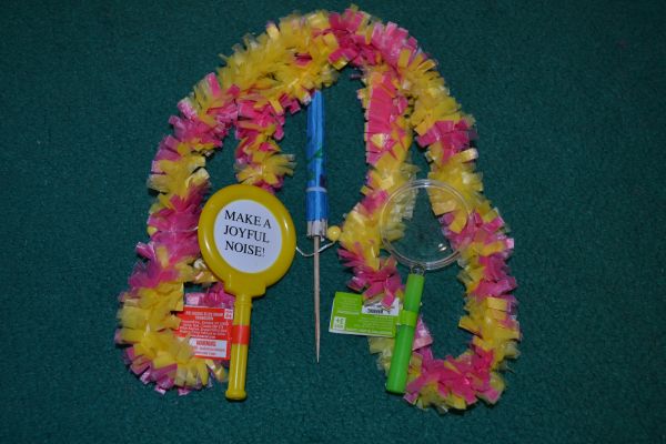A (joyful) noise maker, lei, mini umbrella, and magnifying glass –> encouraging celebration and looking deeper