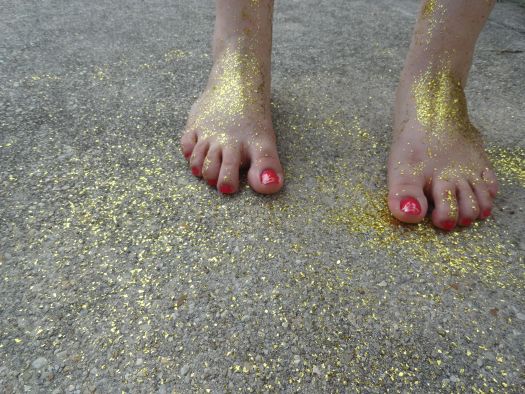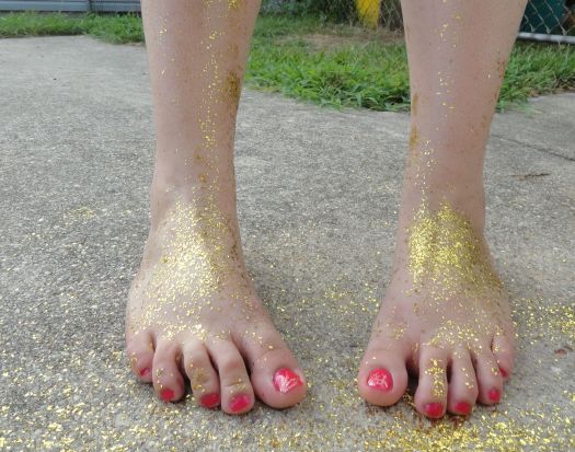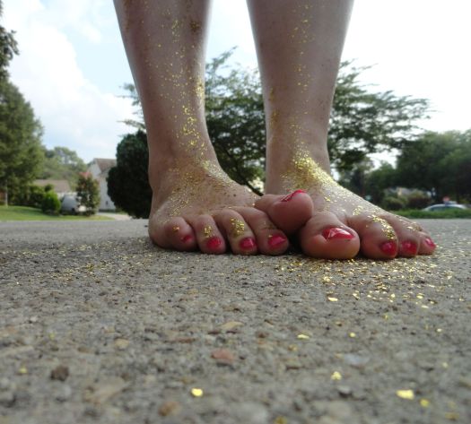 I’ve always loved this photo of someone’s feet covered in glitter. So opened a bottle of gold flakes I’ve been saving for months and months and dumped them all over my legs and feet. They stuck very easily because I had lotion on.