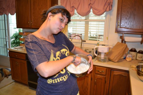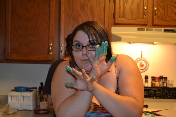 Charlotte, Jenn, and I joined forces in Charlotte’s kitchen to make some beautiful treats. If I’m being honest, Charlotte basically did everything. Jenn supervised me, I danced, and Charlotte mixed the batter. I did choose the colors we dyed the batter and icing, and made the dollops on the pan that would soon grow into cookies.