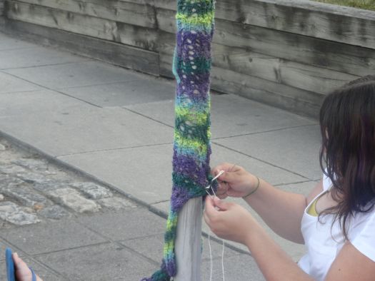 Thursday was my birthday and the main way that I celebrated was by installing another yarnbombing! I did it near the American Visionary Art Museum in Baltimore on Key Highway. It felt good to do it. My goal is to do five this year and I hope to surpass that goal. I do know that I have no intention of capping it at five. 🙂