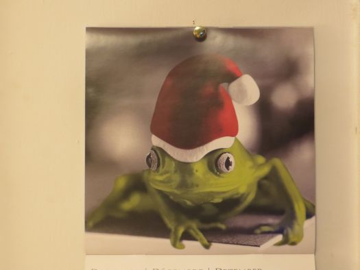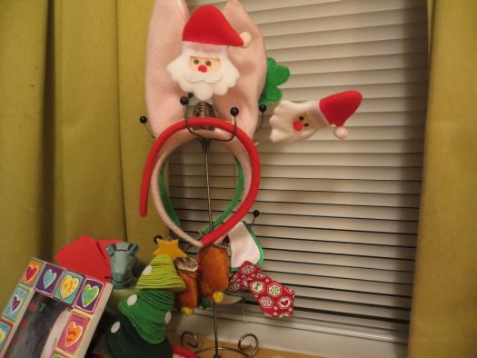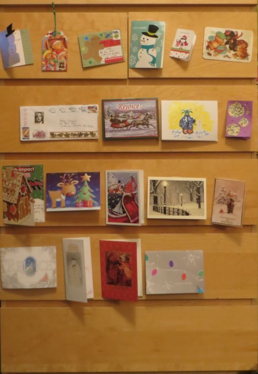Preparing presents and cards isn’t the only thing good about Christmas, though. I really enjoy looking at Christmas lights at night, walking down 34th Street, putting holiday accessories on Bug, displaying my received cards, getting my picture taken with Santa, decorating my room and the cafeteria at work. Secret Santa at work started yesterday too, and we do little gifts for three days and then exchange the last gift on Thursday at lunch. Thursday is also the member party, which will be fun.Here are some festive photos for your enjoyment. Can you spot the card you sent me?
