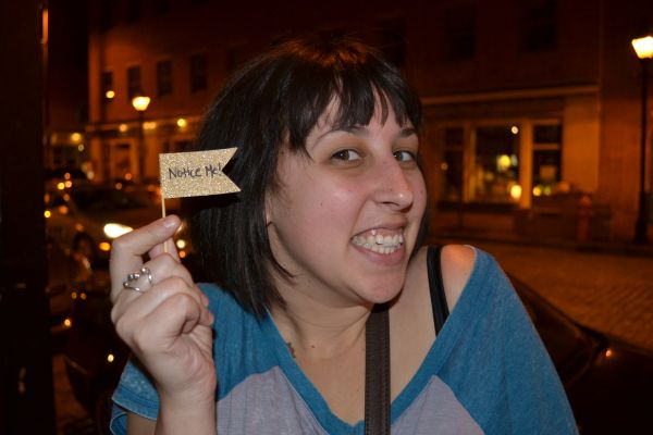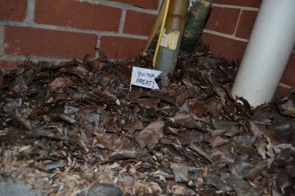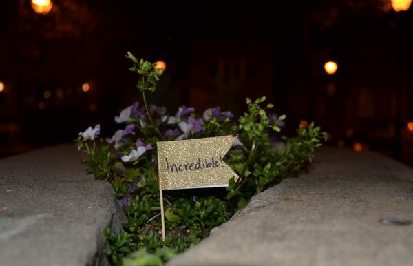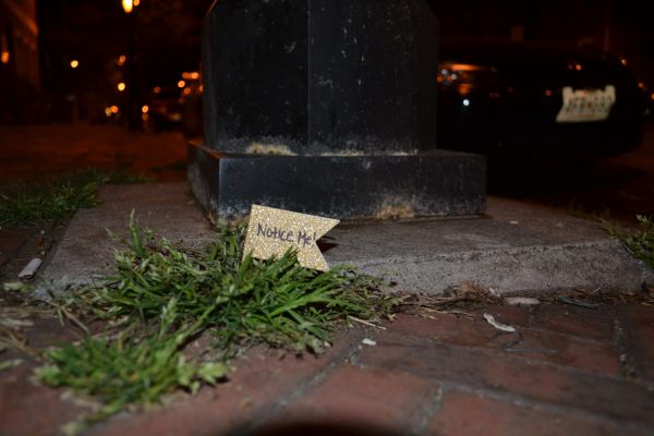 I’m really drawn to the aesthetics of flags, bunting, pennants, etc. So when I saw sparkly gold and silver flags on sticks, I had to buy them. I wasn’t positive what I was going to do with them, but then I realized that the glitter was smooth and I could easily write over it with a Sharpie. So, I wrote positive words or phrases on each one, and took them to Fells Point.