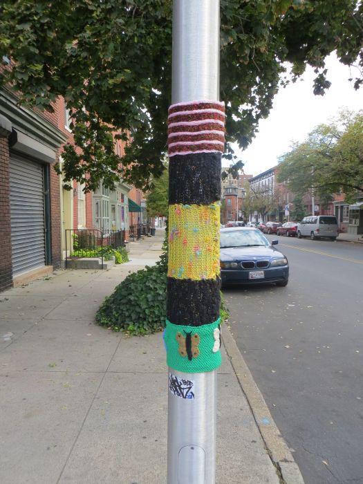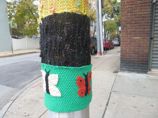 I’m really enjoying the interactions with strangers I’m having through street art. I mentioned a few weeks ago that someone added to one of my yarnbombings. Recently I went back and there was another addition! I’m really excited about this. I’m not sure if it’s from the same person or not, but I love it either way. Next time I go, I’m going to put a little tag so the person knows how to contact me if they want to. Now it’s my turn to add something!