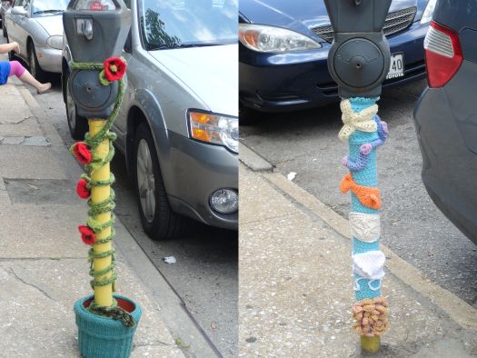 I finally finished everything on Saturday night (with the help of LaShandra offering to take the project home and work on it Thursday night–thank you!!) and went to Hampden with Matt to install it on Sunday. Lovely Yarns has moved but it’s still really close to where it was before. I told the staff there that I was about to sew it on the parking meter and went to work.