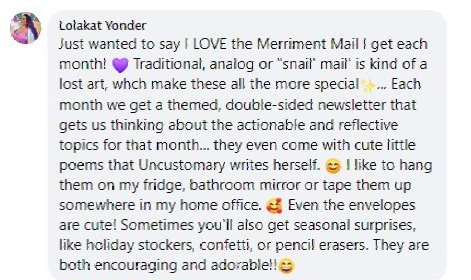 Yes! As soon as you subscribe, you’ll get immediate access to a dashboard of over 20 past Merriment Mail newsletters in printable format. You’ll have plenty of joyful content to dive into while you wait for your first newsletter to arrive in the mail!