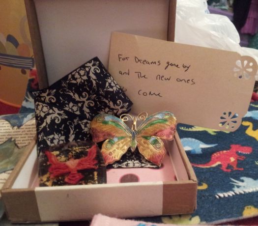 Monica and I decided to do a swap for inspiration and happiness in an Easter basket type container. I sent her a mix CD, a photo album, some postcards with quotes, and other happy things.