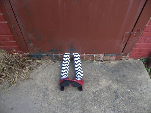 For my 10th Fun A Day project I recreated an installation I saw online of some huge red ruby slippers. The link doesn’t click through, but you can see the original picture here. All I did was get some shoes from the thrift store, painted them red with glitter, and stuffed some black and white striped socks with pillow fluff.