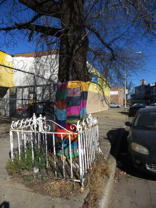 One of my larger projects for Fun A Day was yarnbombing a really wide tree. The tree appealed to me while I was driving because of the charming little white gate that surrounds it. It had a lot of lumps and it was difficult to include the branches, but I’m really glad I added color to this little area. You can find it at the corner of Gay and Fayette Streets, next to a mechanic shop.I like yarnbombs like this, because I can use a whole bunch of different yarns. Color splash everywhere!I’ve done one more big tree like this one, which you can see here. I drove past this on Saturday, so it’s still up! Which is awesome. It’s been two months! 🙂
