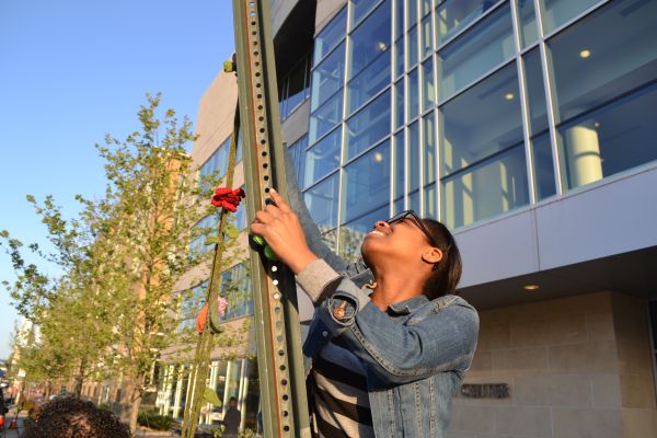 Last week, I came back to help them install. I wanted them to do most of it, because installing your first yarnbomb is a really fun experience.