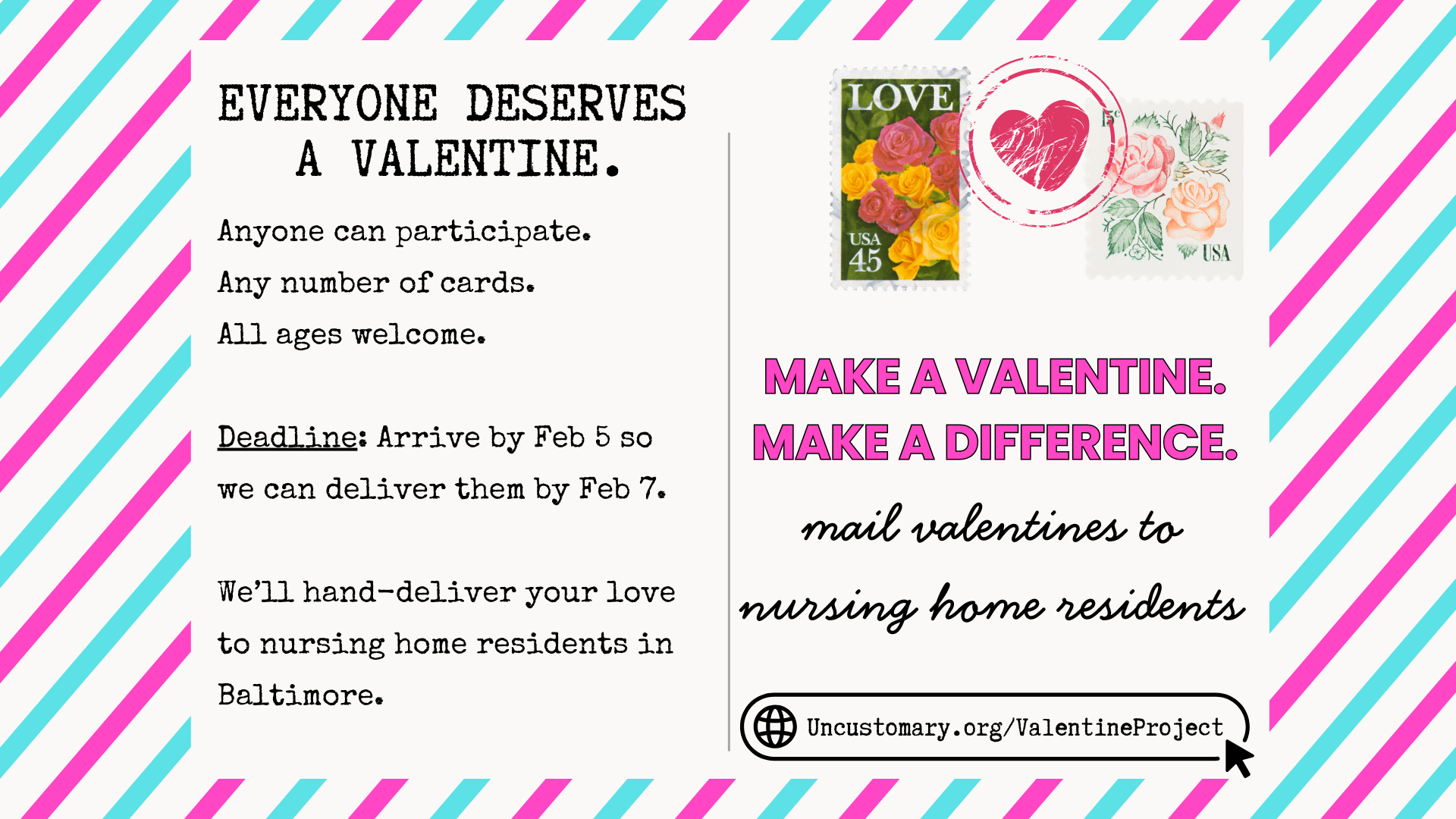 This February, we're on a mission to hand-deliver hundreds of valentines to nursing home residents across Baltimore, and you can help no matter where you live!