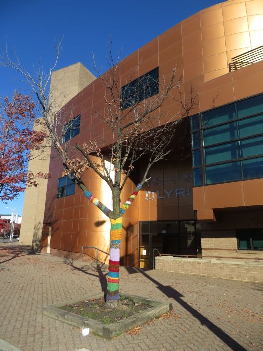 It had been about a month since I yarnbombed anything. It had actually been about that long since I did anything related to street art. I was busy with Halloween, the hurricane, Canada, etc. but now I’m back into the swing of things (while trying to balance Christmas shopping!) and it feels good to be able to share that I yarnbombed a tree this weekend.