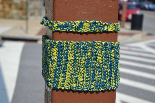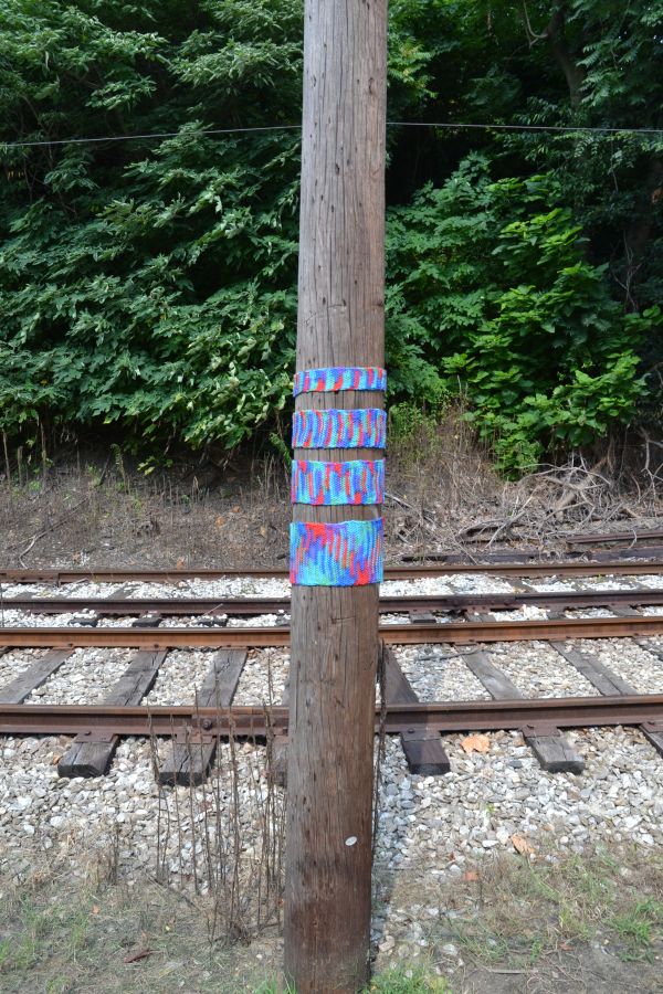 Anyway, that’s my introduction into this yarnbomb I did on the side of a set of train tracks in Baltimore (on Falls Road). I used an entire skein to make different sized rectangles to sew around a pole.