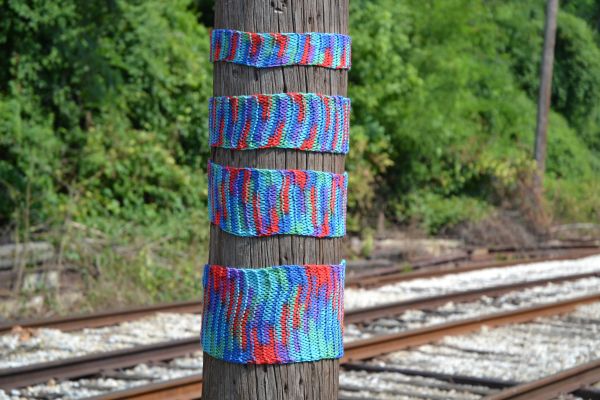 Anyway, that’s my introduction into this yarnbomb I did on the side of a set of train tracks in Baltimore (on Falls Road). I used an entire skein to make different sized rectangles to sew around a pole.